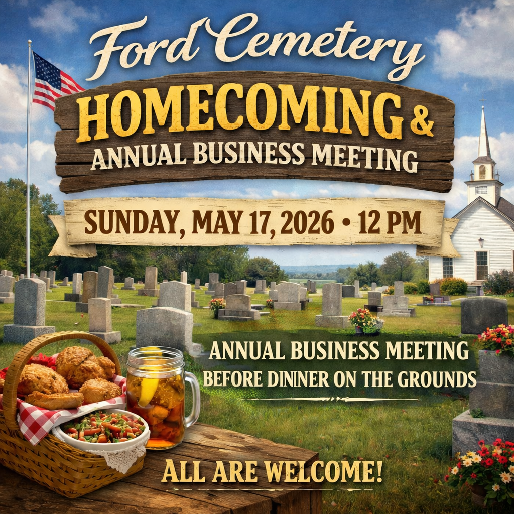 Join us for the 2026 Ford Homecoming Reunion. We will have a fellowship on the grounds on May 17th, 2026, starting at 10:00 AM. Don’t miss the annual business meeting at 12:00 PM. Dinner on the grounds will follow the business meeting. Please bring a covered dish and drinks to share with your friends and family.